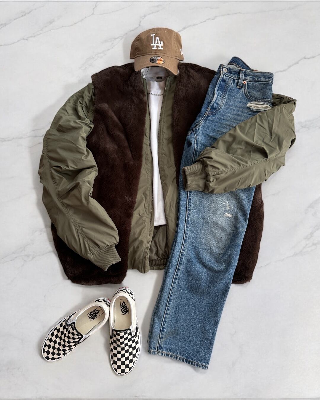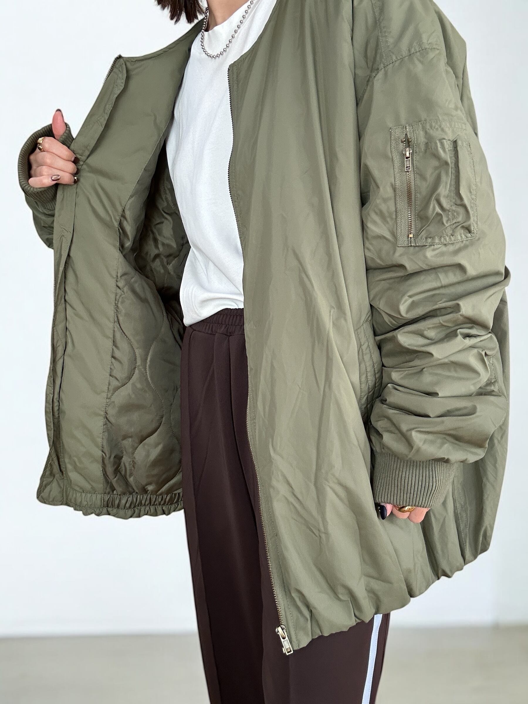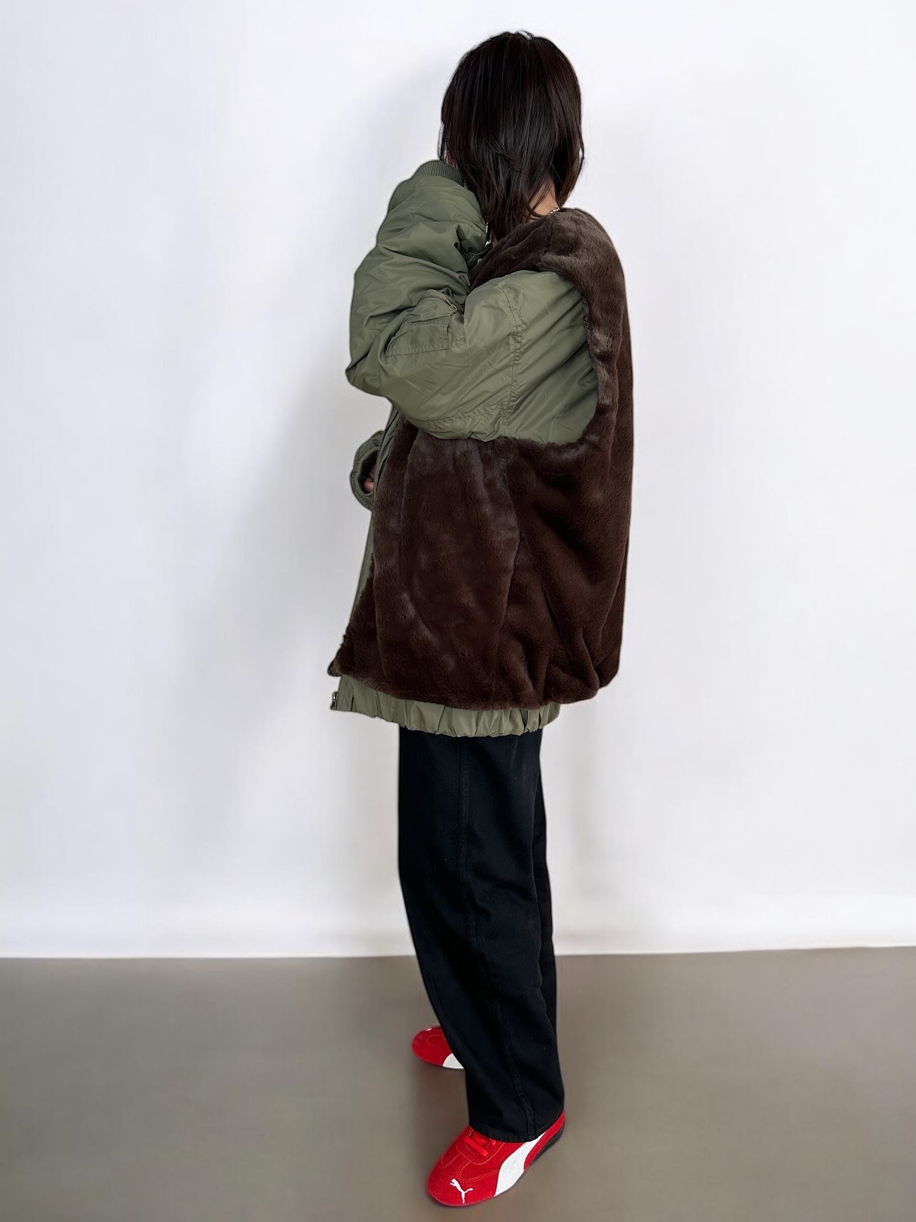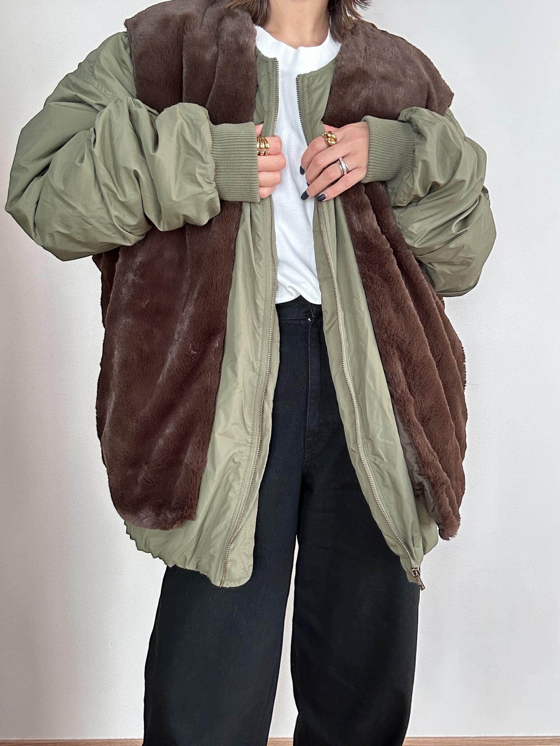 トレンドのオーバーサイズMA-1のファーベストをレイヤーした冬の即戦力ブルゾン MA-1とファーベストのセットアイテムです。